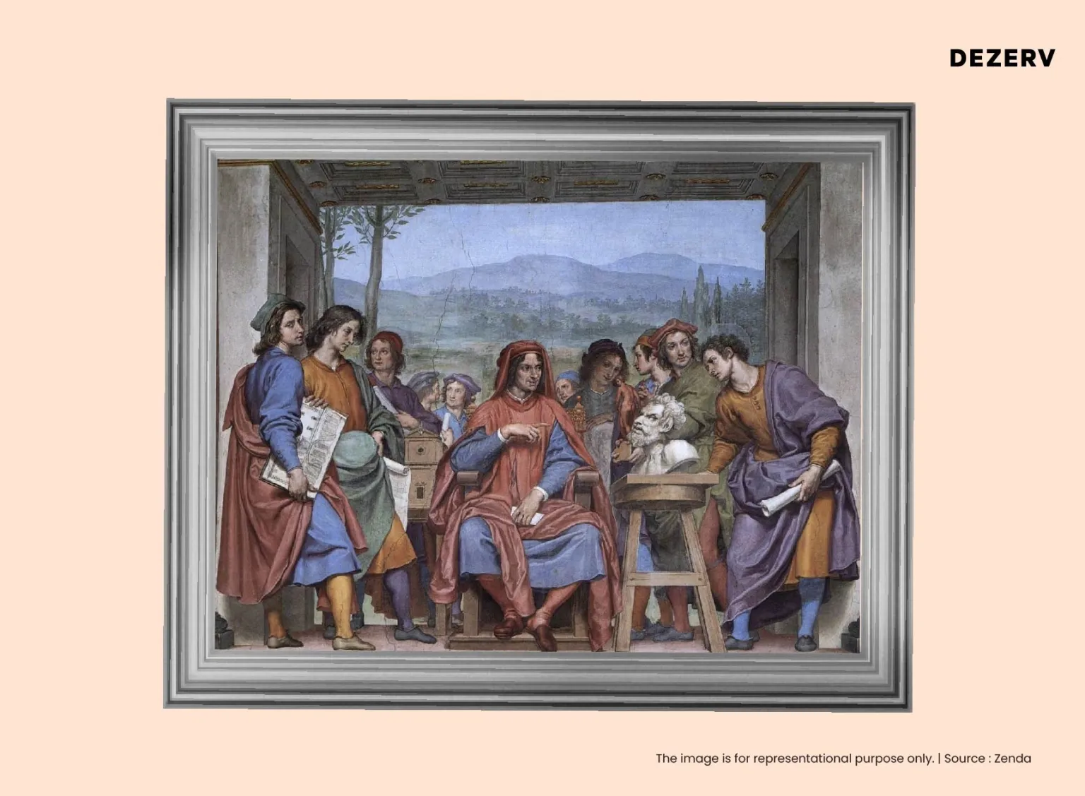 The painting “Lorenzo de’ Medici with Artists” was created by Giorgio Vasari in the 16th century, specifically around 1556. Vasari painted this fresco as part of the decoration for the Palazzo Vecchio in Florence, Italy. It is meant to celebrate the Medici family’s legacy and their role in fostering the Renaissance.