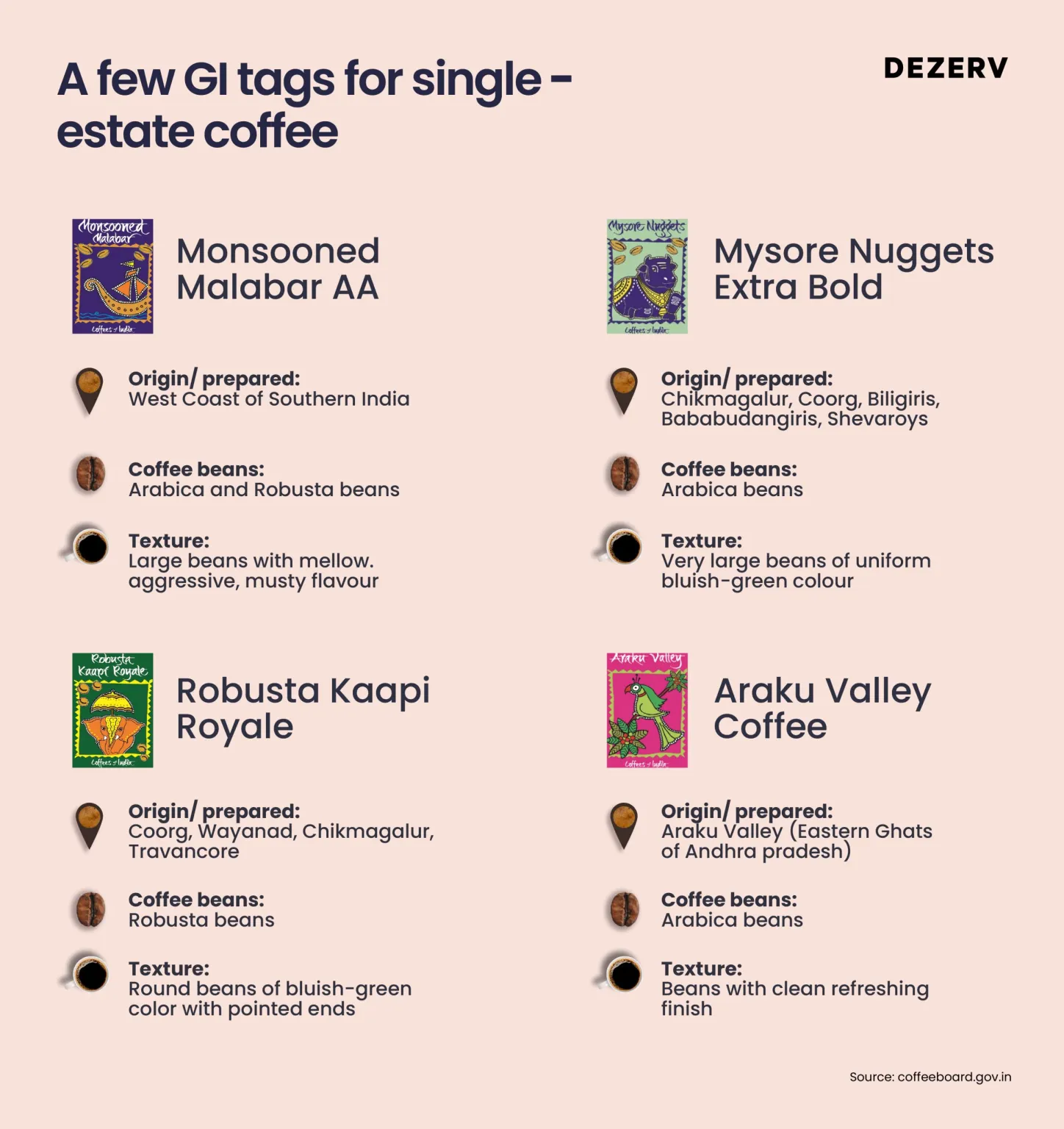 What’s interesting is that the Indian government has granted Geographical Identification (GI) tags to some of these unique coffee varieties.
