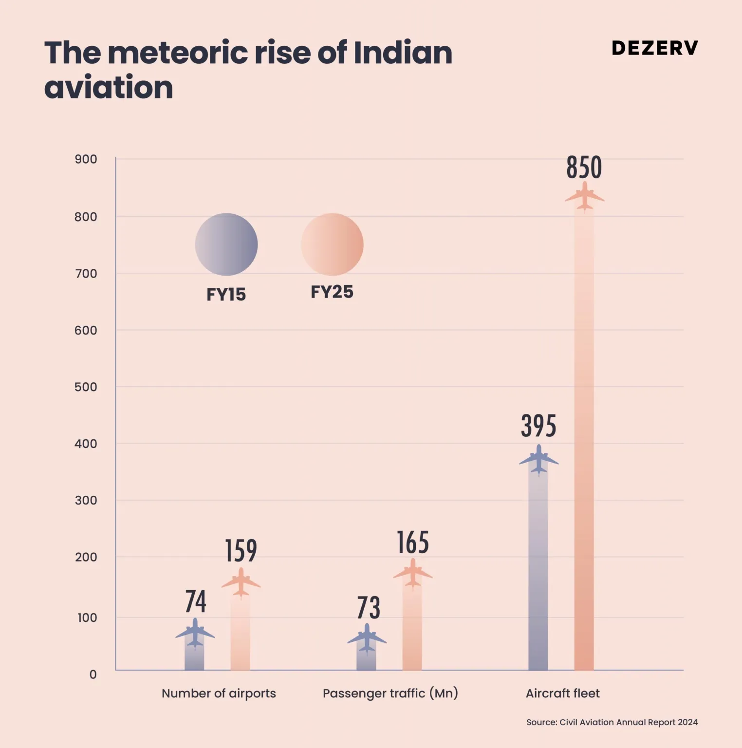 A record 16.5 crore Indians took to the skies in FY25. IndiGo has become the world’s most valuable airline, overtaking Delta. Air India is undergoing a historic transformation, placing an order for 470 aircraft, the largest in global aviation history at the time.