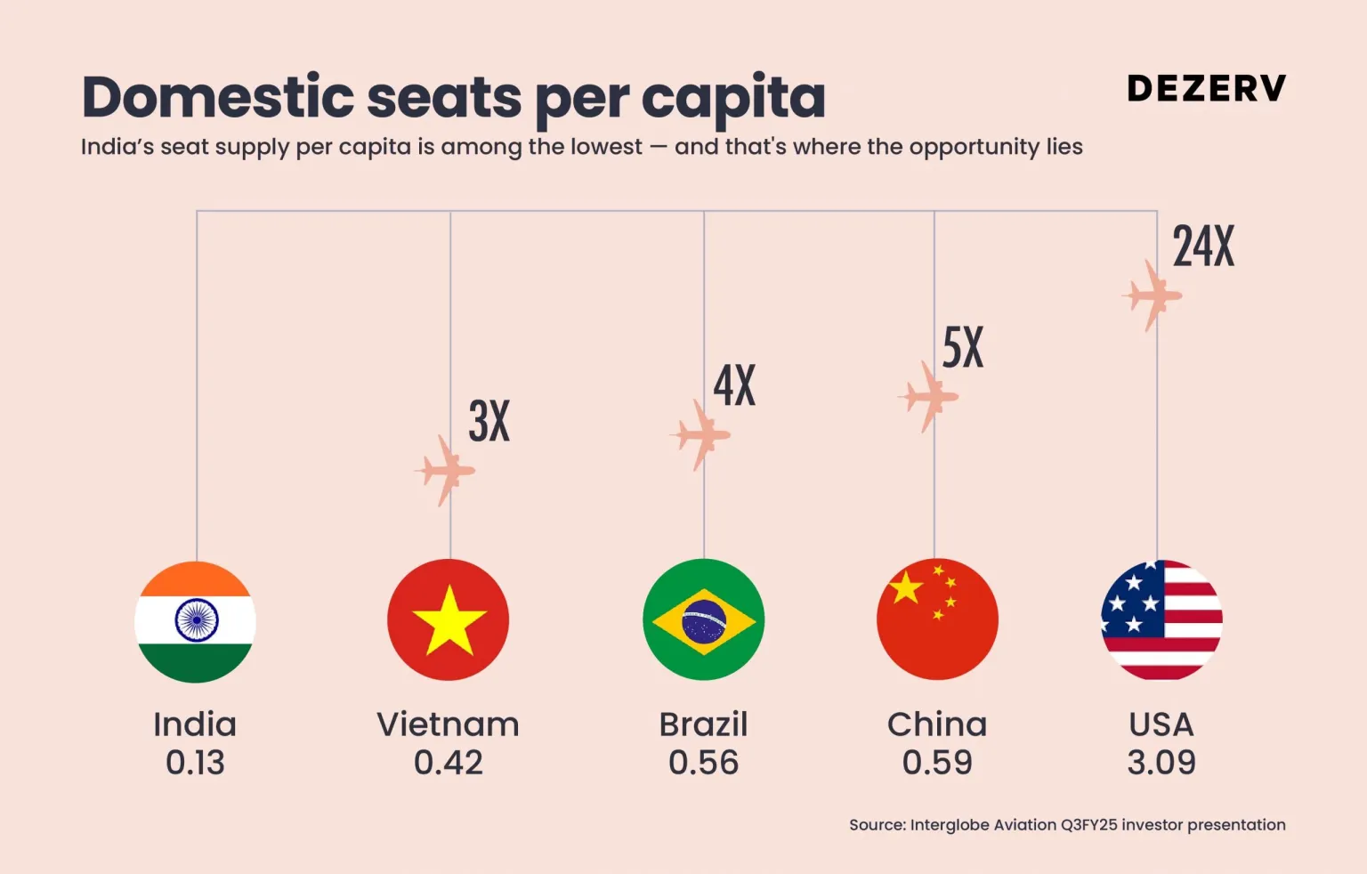 And the headroom is undeniable. India’s domestic seat capacity per capita stands at just 0.13 — far behind peers like Vietnam (0.42), Brazil (0.56), and China (0.59), and nearly 24x lower than the US (3.09), signifying that even small shifts in capacity could translate into outsized growth.