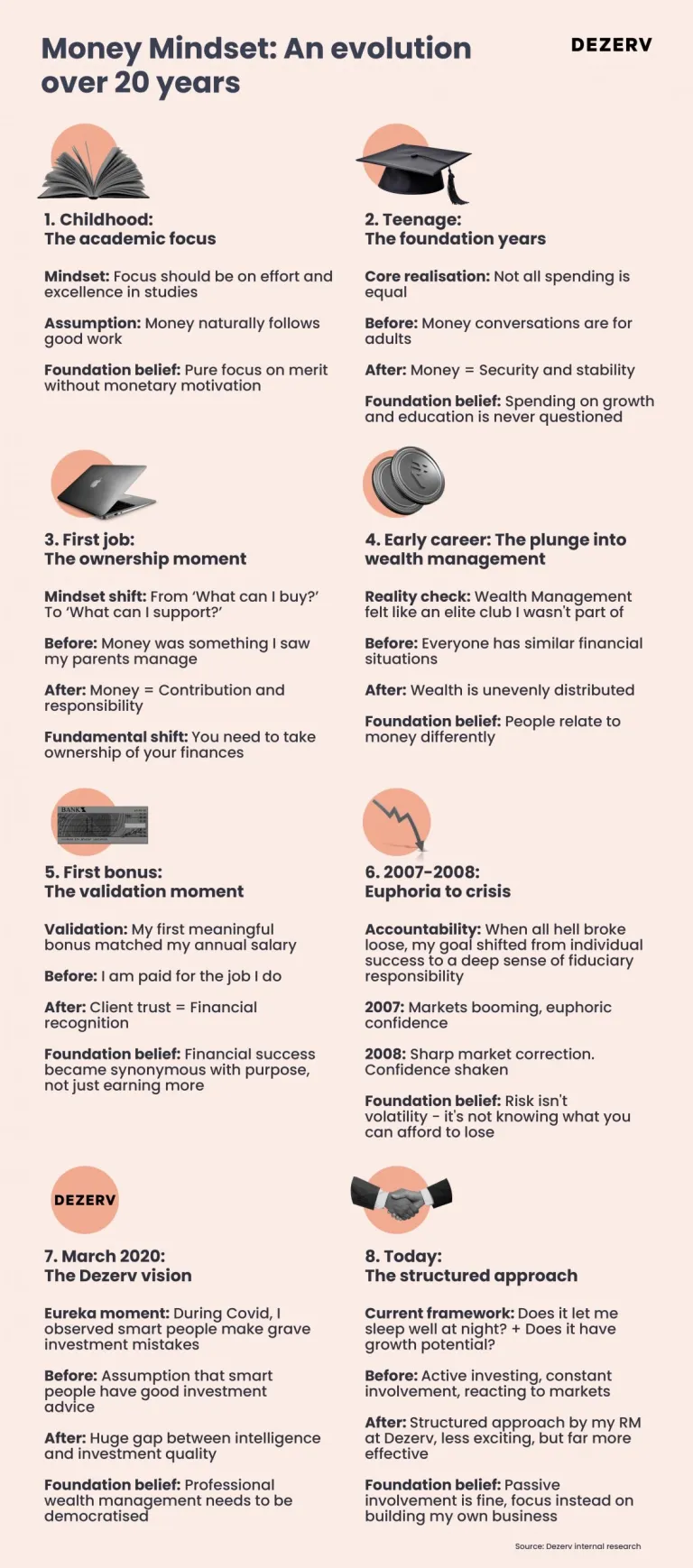 - Founding clarity: During the March 2020 COVID wave, portfolio misalignment in a friend’s holdings inspired the creation of Dezerv. I realized that “what really moves you forward…is clarity,” not constant action.