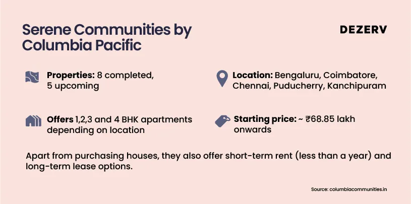 With multiple operational communities across cities like Bengaluru, Chennai, and Pune, Serene Communities by Columbia Pacific is the largest senior living provider in India. Their projects are strategically located in urban areas, offering convenience and comfort.
