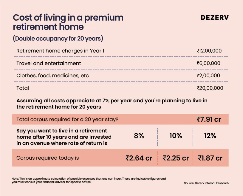 Let’s say you plan to live in one such community for 20 years, at double occupancy with an annual increment of 7%; here’s how much you need to have as a corpus.