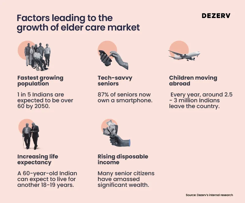 This has led to the growth of the so-called ‘Silver Economy.’ The eldercare market in India is worth USD 7 billion and is expected to reach USD 50 billion by 2030