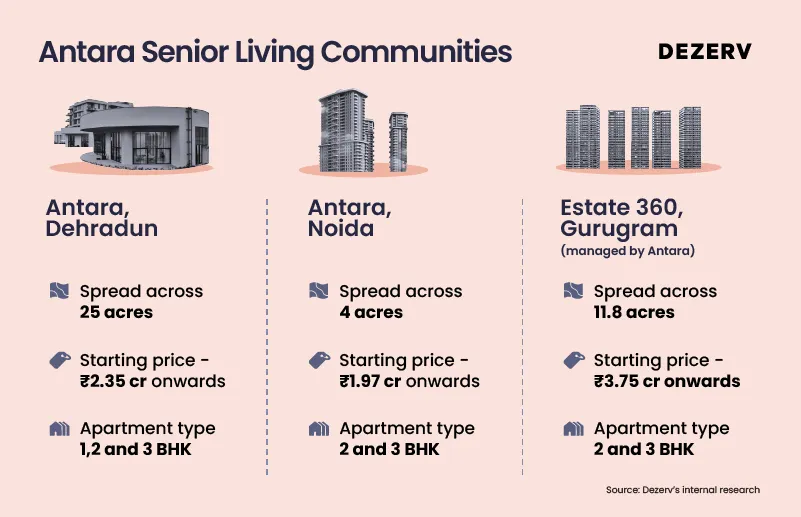 Upcoming projects: Antara is expanding its footprint with new projects planned in Gurugram and other metro cities. Their latest project, Estate 360, offers intergenerational living with 2 out of 6 residence properties listed for senior living. Here’s their brochure for more details.