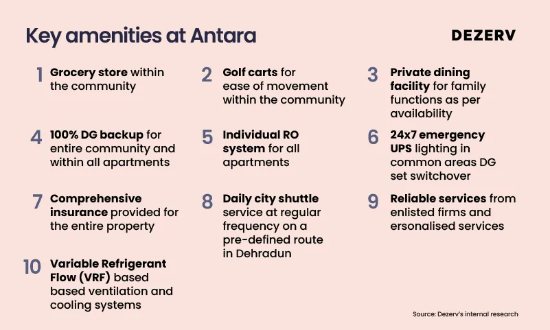 Facilities provided: Antara provides a curated lifestyle with concierge services, wellness programs, fine dining, and access to 24/7 healthcare. The Dehradun facility boasts landscaped gardens and a wellness centre, while Noida offers proximity to top medical facilities.