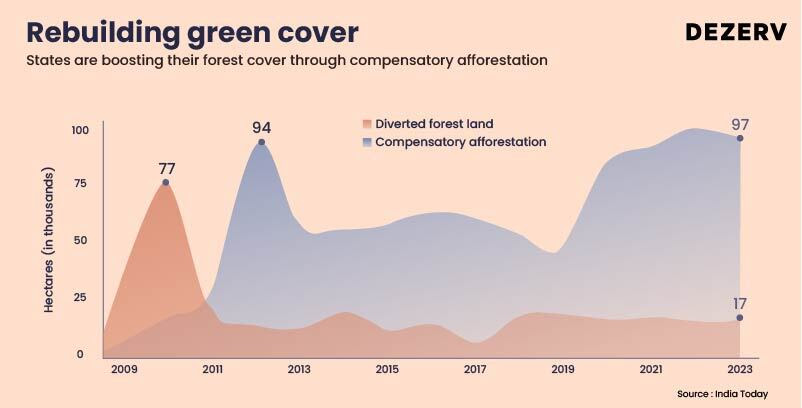 Approximately 9.3 lakh hectares of land underwent compensatory afforestation initiatives between 2008 and 2023.