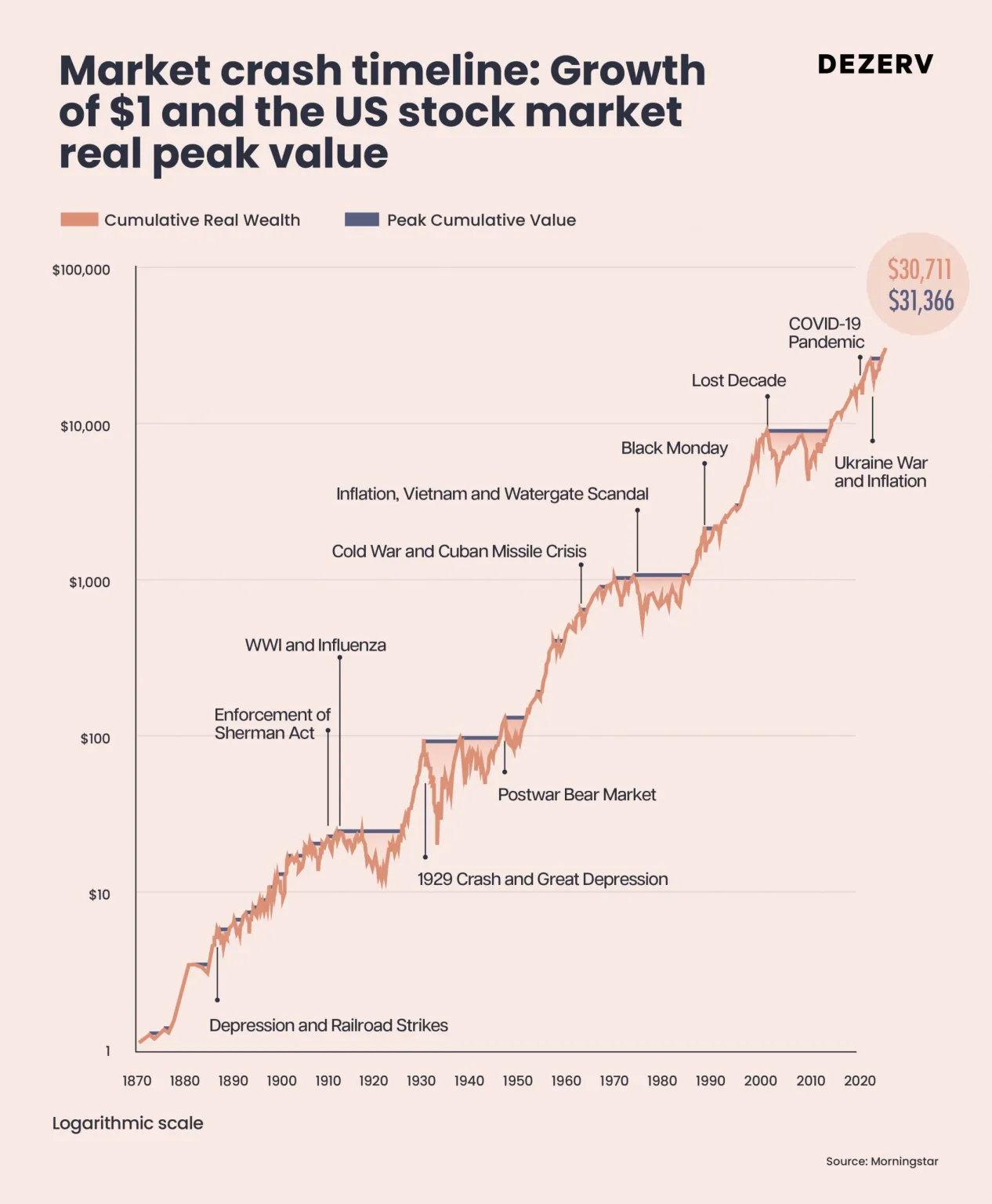The chart plots how a single dollar invested in the US stock market, adjusted for inflation, has grown over time—showcasing major crashes from the 1800s to the post-pandemic era.