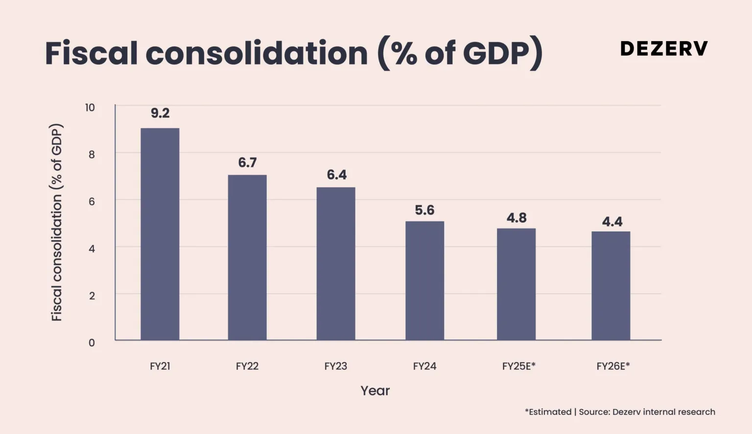 3. Fiscal consolidation – India has made significant progress in fiscal consolidation, with the fiscal deficit decreasing from 9.2% of GDP in FY21 to 5.6% in FY24, with projections of further reduction to 4.8% in FY25E and 4.4% in FY26E. This disciplined approach to public finances enhances macroeconomic stability, and in turn propels the equity markets.
