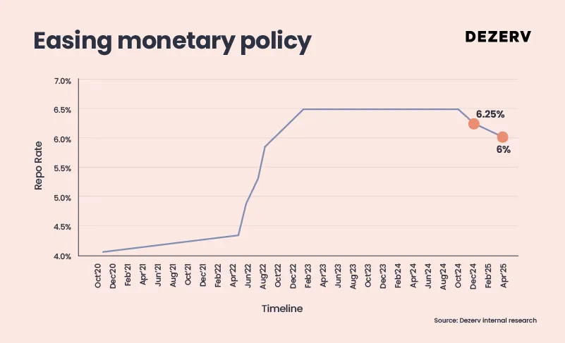 1. Easing Monetary Policy – In this week’s Monetary Policy Committee (MPC) meeting, the Reserve Bank of India (RBI) announced a 25-basis-point reduction in the repo rate—from 6.25% to 6.00%. Additionally, the MPC changed its stance from neutral to accommodative, clearly signalling support for growth through potential future rate cuts.