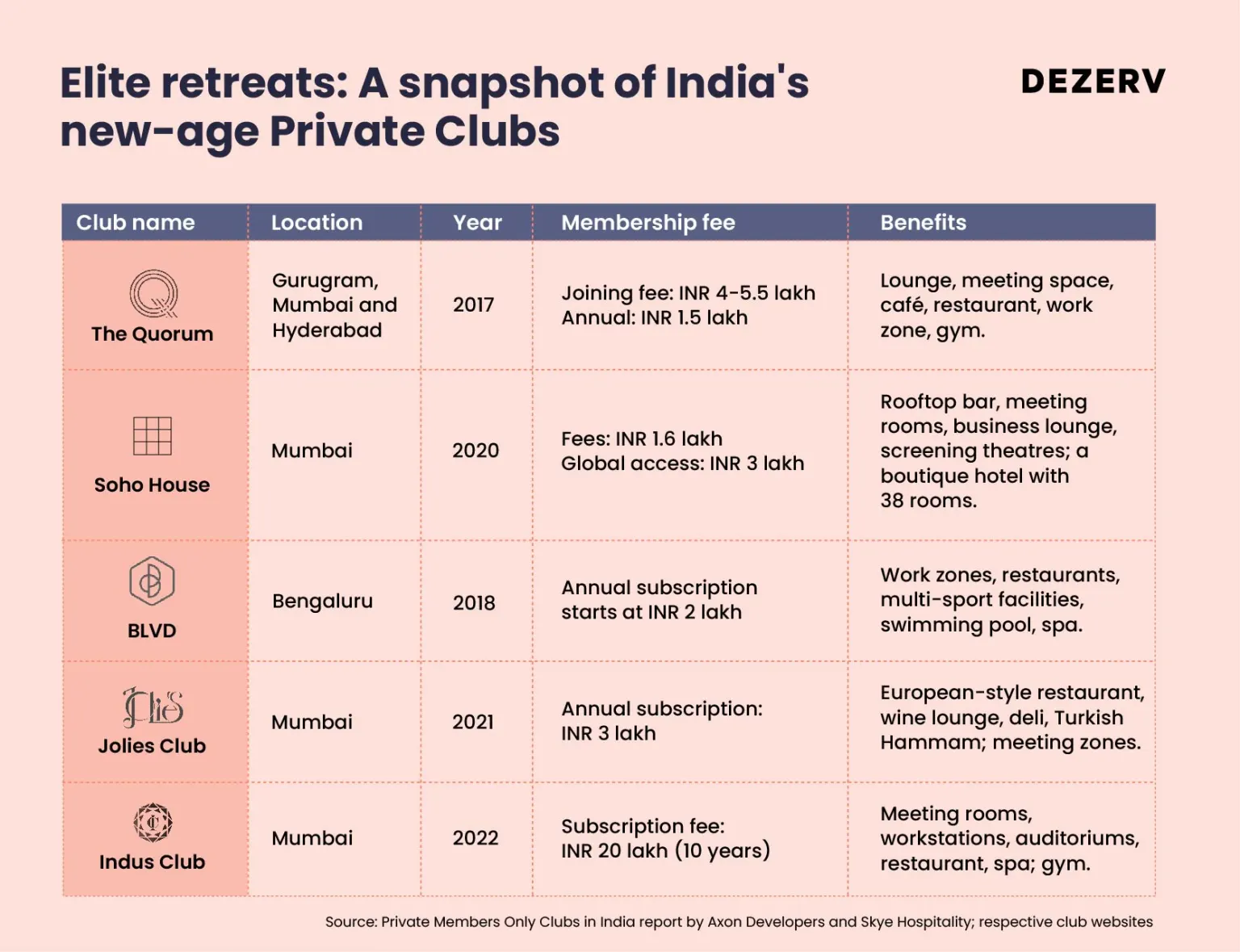 - Pricing: Monthly memberships from INR 10,000-1 lakh, joining fees up to INR 5 lakhs